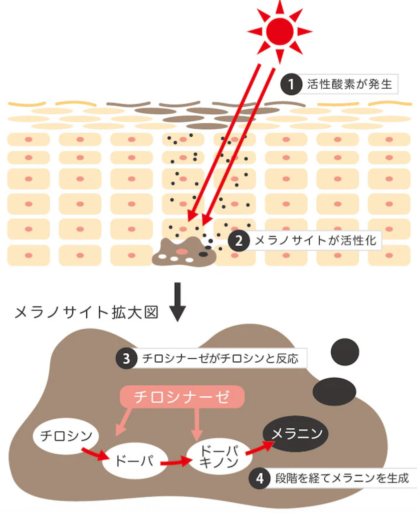 紫外線を浴びると、肌はダメージから自分を守るために「メラニン」という色素を作り出します。