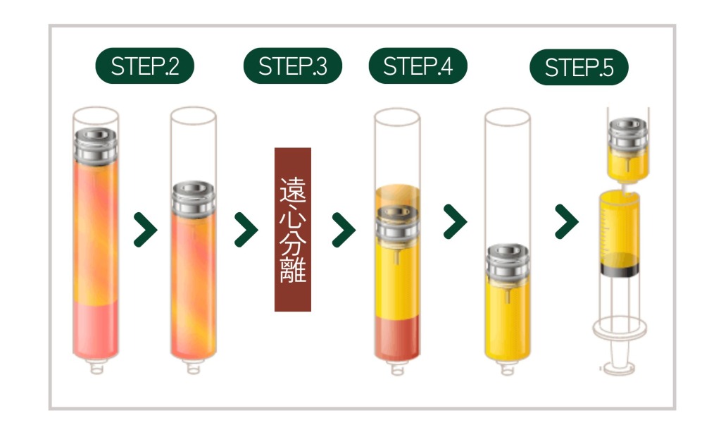 遠心分離にかけると、シリンジの中身は自然に三層に分かれます。