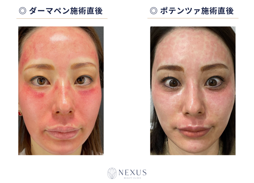 ポテンツァの大きな魅力のひとつは、ダーマペンと比べてダウンタイムが短いことです。その秘密は、高周波(RF)の力にあります。針を刺した瞬間に熱で毛細血管を収縮させるため、出血や炎症が最小限に抑えられます。同じ毛穴・ニキビ跡治療でも、ダーマペンと比較すると効果が強くダウンタイムが短いのは嬉しいポイントです。