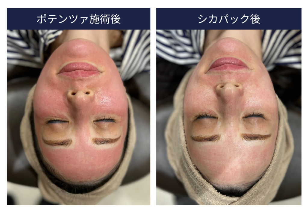 CICAパックは、ツボクサエキス(シカ成分)を配合した鎮静パックで、炎症を抑えて肌を落ち着かせる効果があります。施術直後の火照った肌に使用することで、赤みや腫れを最小限に抑えることができるため、ダウンタイムを短縮したい方にぴったりです。