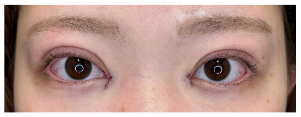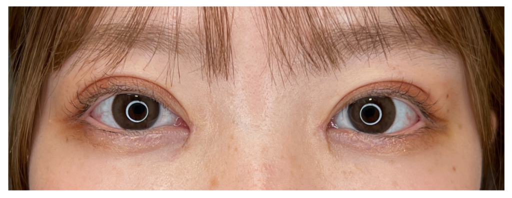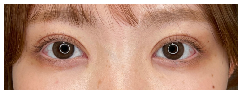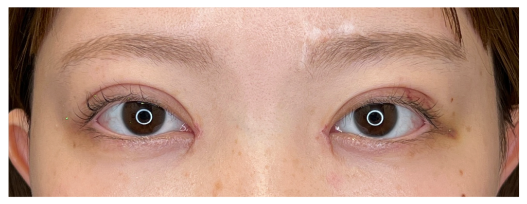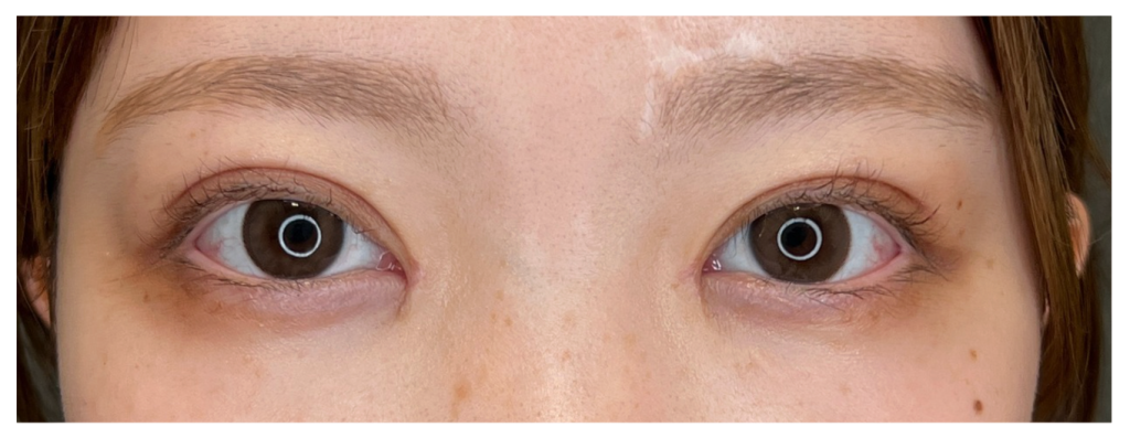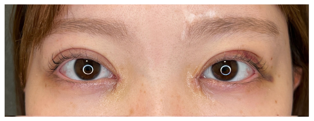 本症例では、術後翌日に腫れのピークが見られました。個人差はありますが、目頭切開のダウンタイムでは翌日〜2日目にかけて腫れが最も強く出やすいとされています。腫れが強く出ることで、一時的に目の開きが悪く見えることもあり、黒目が少し隠れて見える場合があります。