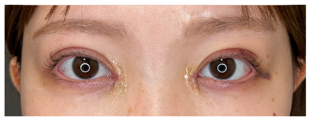 また、目頭部分の内出血は大きな変化は見られませんでしたが、二重幅に沿って内出血がやや濃く出てきているのが確認できます。