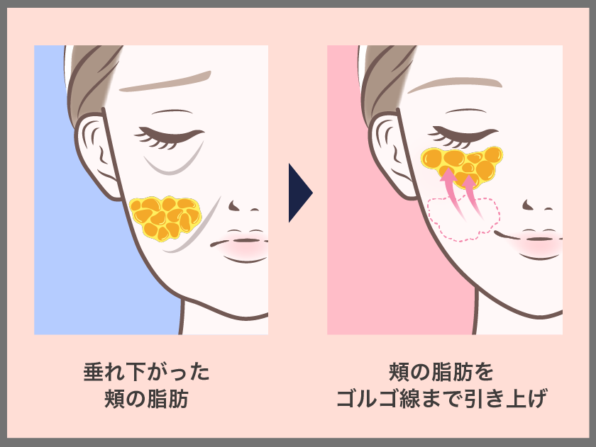 頬の深部組織(脂肪や靭帯)に直接アプローチし、本来の若い頃の位置へ引き上げて固定する手術です。