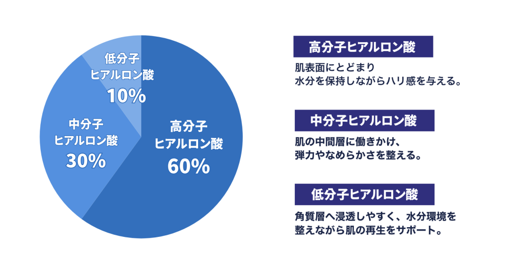 それぞれのヒアルロン酸が肌の異なる層に働きかけることで、表面的なうるおいだけでなく、弾力や水分バランスまで多角的に整えていきます。