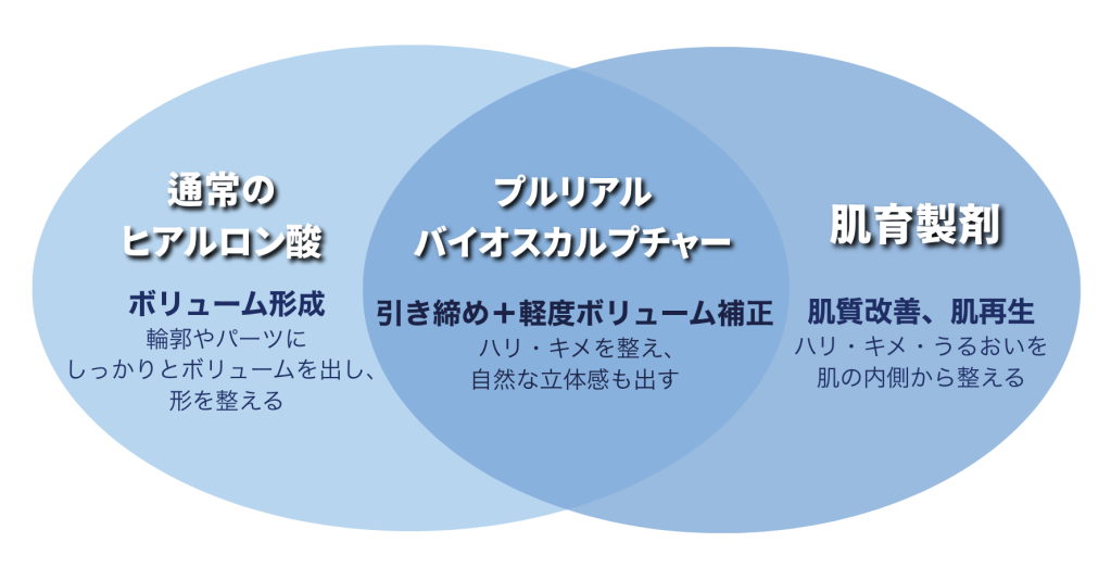 プルリアル バイオスカルプチャーは、複数の分子量を組み合わせたヒアルロン酸を主成分とする、肌の引き締めと軽度のボリューム改善を目的とした製剤です。