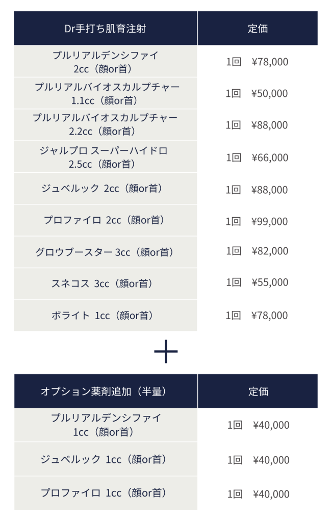 | プルリアルデンシファイ 1cc (顔or首) | ¥40,000 | ¥108,000 |