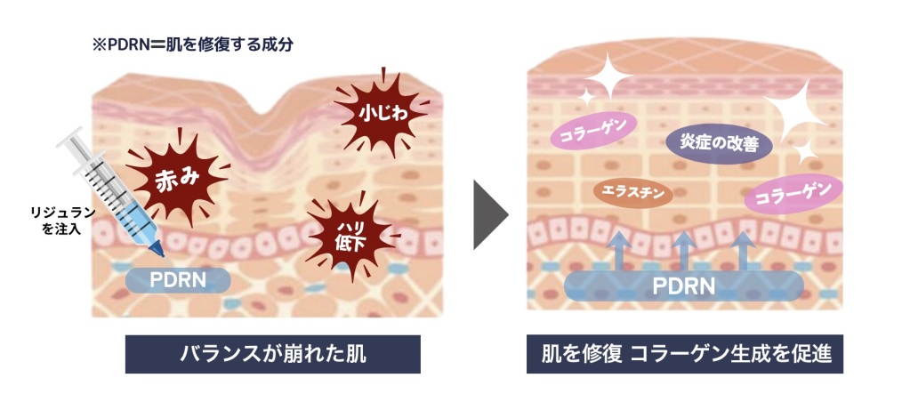 リジュランの主成分であるPDRN(ポリデオキシリボヌクレオチド)は、肌の修復・再生を促し、ダメージを受けた肌環境を整える働きがあります。炎症やゆらぎを抑えながらバリア機能を整え、赤みや小じわの改善にもつながります。肌に栄養を与えて育てていくようなイメージです。