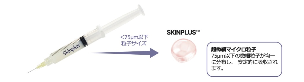75μm以下の微細な粒子に加工されており、皮膚内で均一に広がりやすいのが特徴です。他のコラーゲン製剤と比較しても粒子が細かく、より自然でなめらかな仕上がりにつながります。また、しこりが生じにくい設計となっており、安心して受けていただける治療です。
