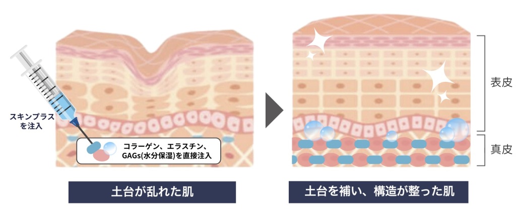 スキンプラスは、ヒト由来の構造成分を主成分とした肌育製剤です。コラーゲンやエラスチンなど、肌の土台を支える成分を直接補うことで、乱れた肌環境を整え、ハリや弾力の向上、キメの整い、乾燥やゆらぎの改善へ導きます。