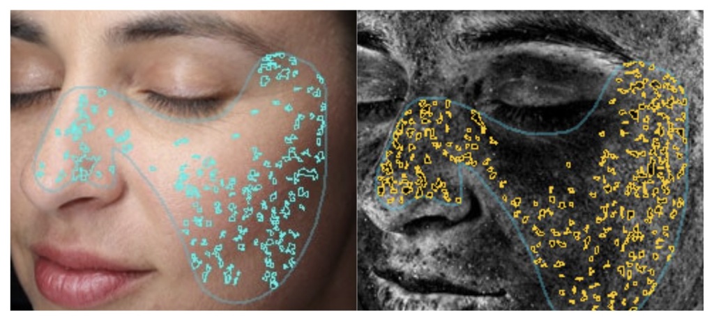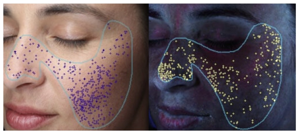 陰影解析により毛穴の数や広がりを評価します。さらに、アクネ菌由来のポルフィリン量を解析し、ニキビの状態や将来的リスクを把握します。